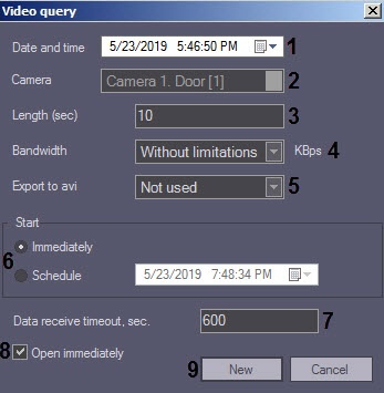 If the Open immediately check box (8) is selected, the data is put into the video archive and shown immediately. Otherwise, the data is only sent to the archive. To view such data, use the Monitoring reports component.