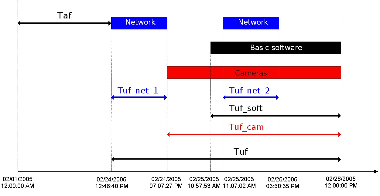 This example uses the time period from 12 a.m. on February 1, 2005, to 12 p.m. on February 28, 2005, to create a statistical report. The readiness rate of an object is calculated as a ratio between the duration of the time period when the object was functioning and the duration of the time period used for the report: