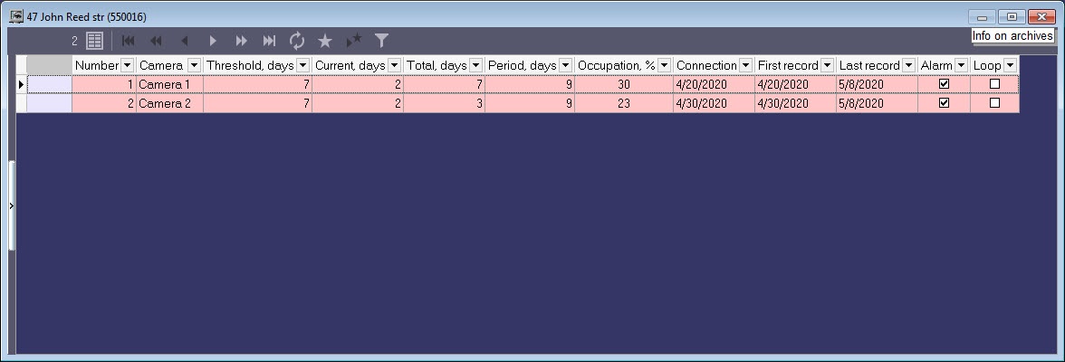 Suppose that at the time of the current date 12.05.2020, the video was recorded to the archive on the following days: 20.04, 21.04, 22.04, 28.04, 30.04, 07.05, 08.05. That is, the total archive size = 7 days (the Total, days field).