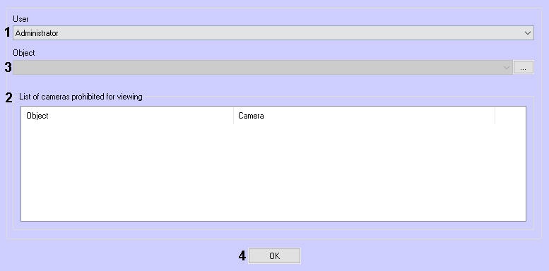 The List of cameras prohibited for viewing field (2) displays the cameras prohibited from viewing for the selected user. To add a camera to the list, select the required object from the Object drop-down list (3) and click the button.