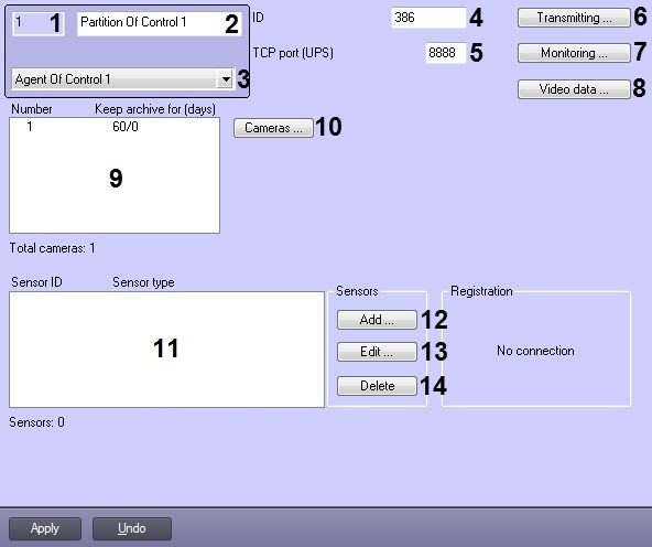 11 | Sensors | Using the Add, Edit and Delete buttons | Displays IDs and types of sensors whose state is monitored by Agent of Control and on whose triggering video data are sent to the Server of Control. | - | - | - |