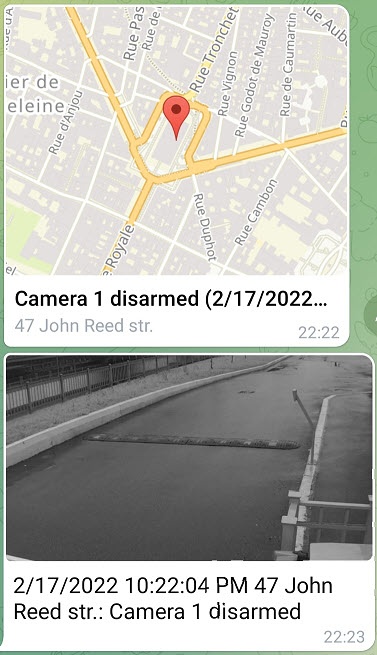 Set the Frames checkbox (5) to relay the jpeg frame linked to the event. When the checkbox is set, 2 messages will be sent to Telegram: an alarm, and then a frame: