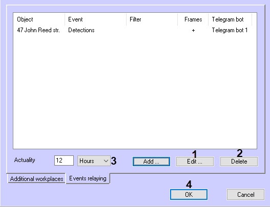 - Click the OK button (6). As a result, the Event relaying form will be closed and a new entry will appear in the list in the monitoring settings window: